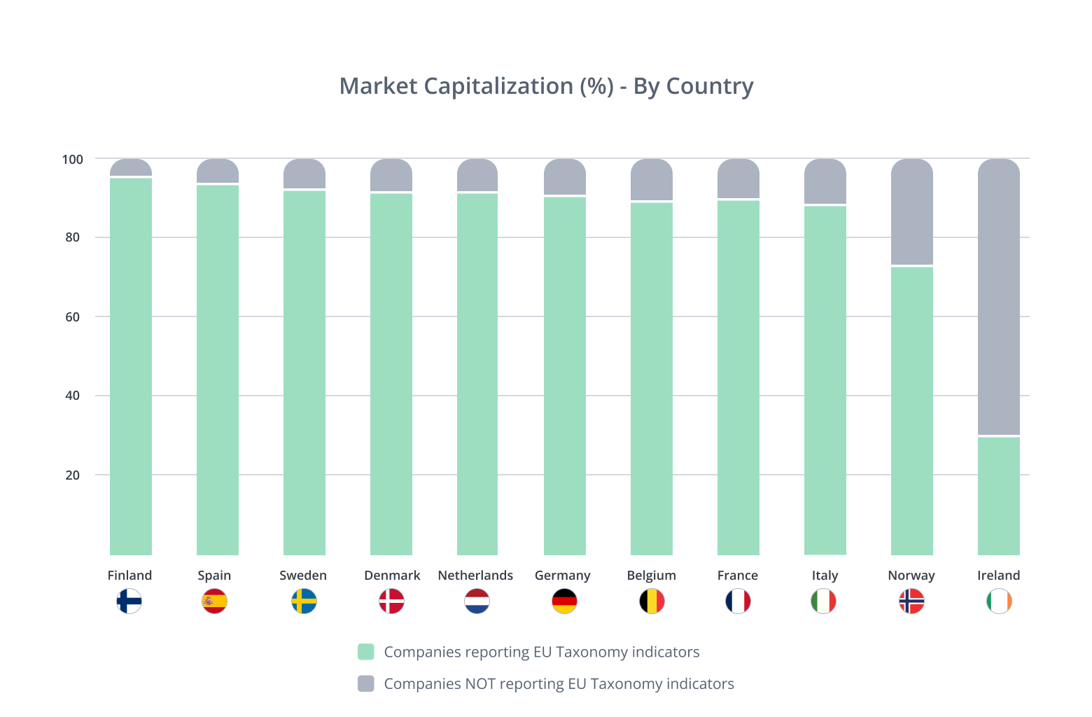 By geography, we found that companies in Finland have the highest propensity to report their EU Taxonomy figures. On the other side of the spectrum, companies based in Ireland, many of which actually carry out the bulk of their activities in the US, are less likely to report their EU Taxonomy figures. In particular, American companies headquartered in Ireland account for 25% of the market capitalization of all listed NFRD companies that are not reporting. This group includes some well-known companies that moved their jurisdiction to Ireland to benefit from favorable tax conditions.