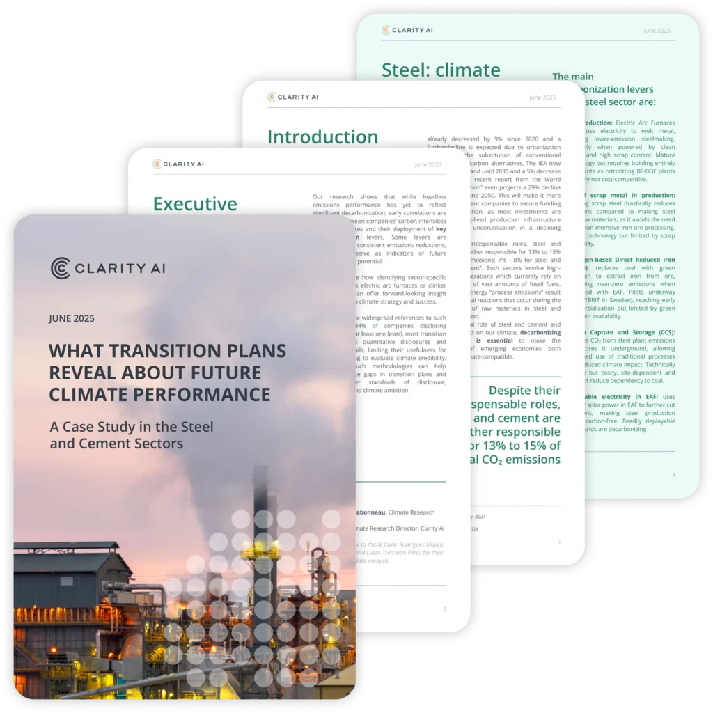 Esta investigación se sumerge en el eslabón perdido entre los objetivos climáticos y los resultados en el mundo real: el plan de transición. Clarity AI analizó 50 de las empresas más emisoras del mundo en los sectores del acero y el cemento para descubrir qué planes están respaldados por acciones y cuáles se quedan cortos.