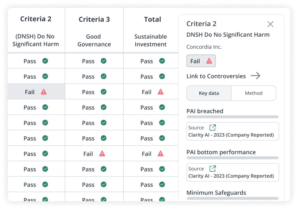 Clarity AI provides 5,652 metrics for 65,000+ companies, covering fixed income, equities, sustainable bonds, and funds. The platform generates 205 EU Taxonomy Article 8 metrics for all securities, ensuring complete regulatory coverage. Every reported data point is traceable to its original source, enabling full transparency. Clarity AI ensures high-quality, audit-ready data by leveraging a structured methodology to maintain consistency and accuracy across its dataset.