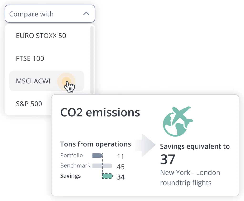 Reports cover nine intuitive metrics across key environmental and social themes, like CO₂ emissions, energy use, water consumption, waste generation, gender diversity, and job creation. They can be benchmarked against a wide range of indexes and other portfolios, and are expressed in real-world equivalents such as flights or household usage to make them relatable, and easy to understand.