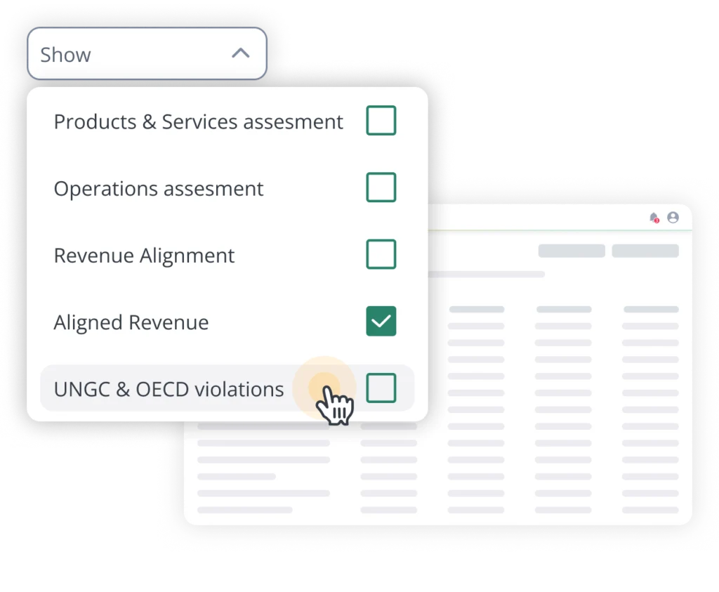 Andiamo ben oltre gli approfondimenti a livello settoriale, offrendo dati sull'allineamento dei ricavi in oltre 2.000 linee di business e una granularità a livello di tematiche. Sono inoltre disponibili disaggregazioni geografiche, dati operativi e screening basato sulle norme (UNGC, OCSE). Questo livello di dettaglio consente una progettazione precisa dei fondi tematici, valutazioni interne del rischio o dell'impatto e una rendicontazione credibile agli stakeholder. È stato progettato per servire i gestori di portafoglio, gli analisti, i team di conformità e i team rivolti ai clienti.