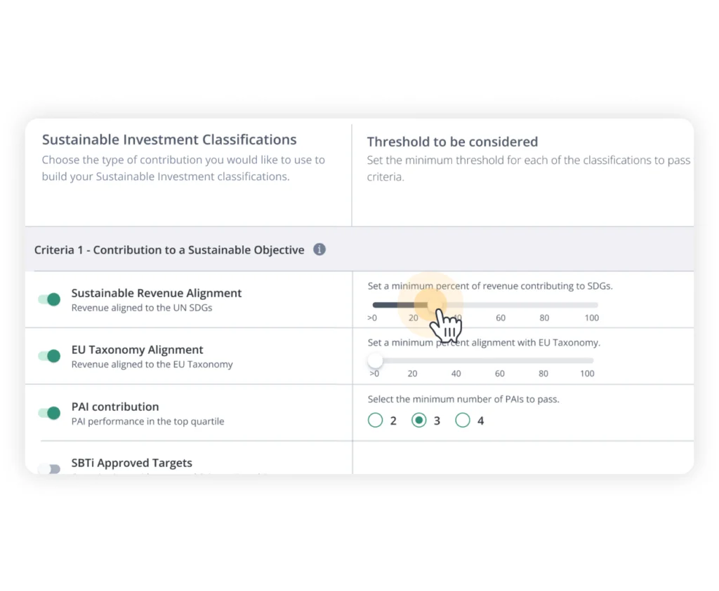 - Custom thresholds, contribution criteria, and Do No Significant Harm rules