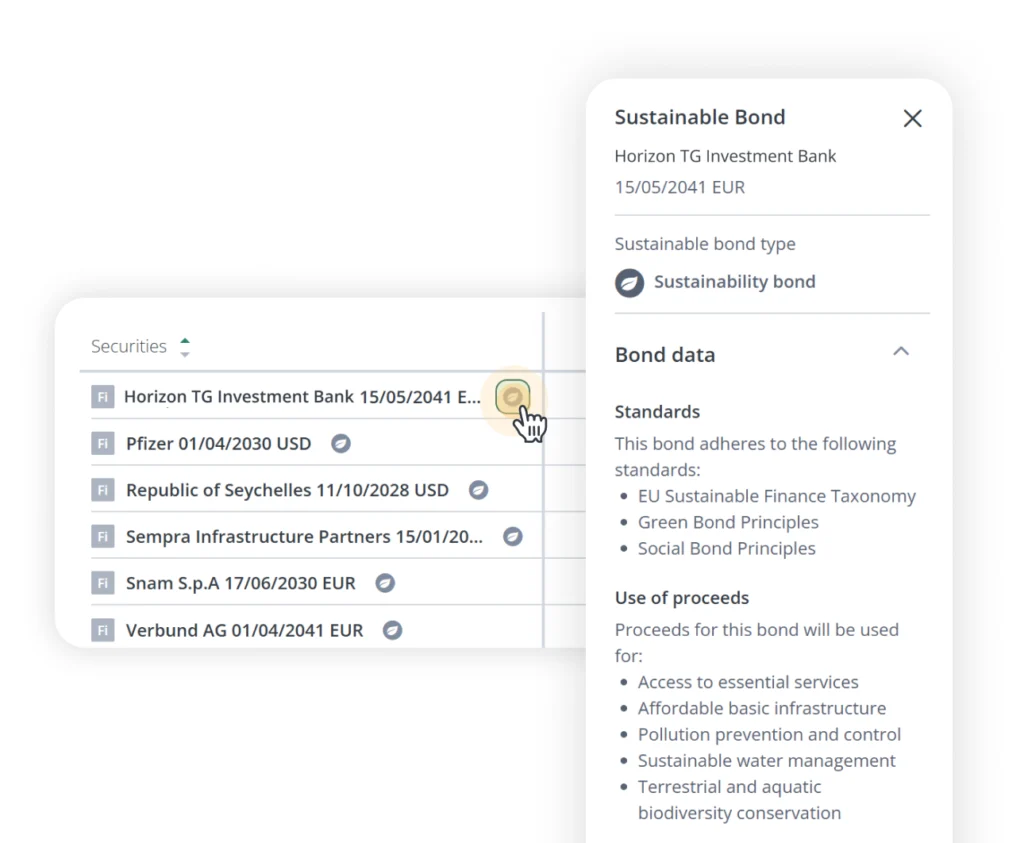Strengthen your fund’s sustainability story with clear, regulation-aligned classifications, including full Article 8 & 9 support and sustainable bonds.