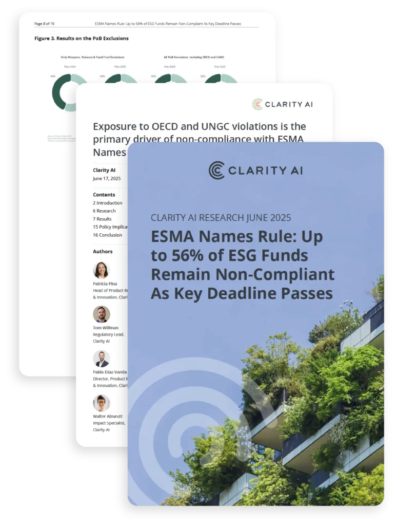 The May 21st deadline for compliance with ESMA’s fund naming guidelines has passed, but new research from Clarity AI reveals that as many as 56% of ESG funds may still be non-compliant. Many asset managers are unknowingly exposed to companies in breach of OECD and UNGC principles, despite apparent alignment on other exclusion criteria like weapons, tobacco, and fossil fuels.